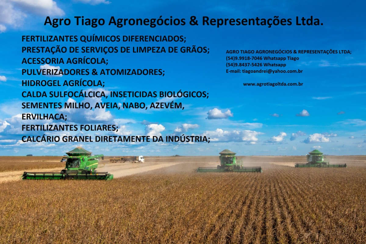 Agro Tiago Agronegócios & Representações atua com Representação Comercial de Fertilizantes Químicos, Hidrogel para plantio, Rações, Fertilizantes Foliares, Sementes, Calda Sulfocálcica, Produtos Orgânicos, Máquinas Agrícolas, Pulverizadores & Atomizadores.